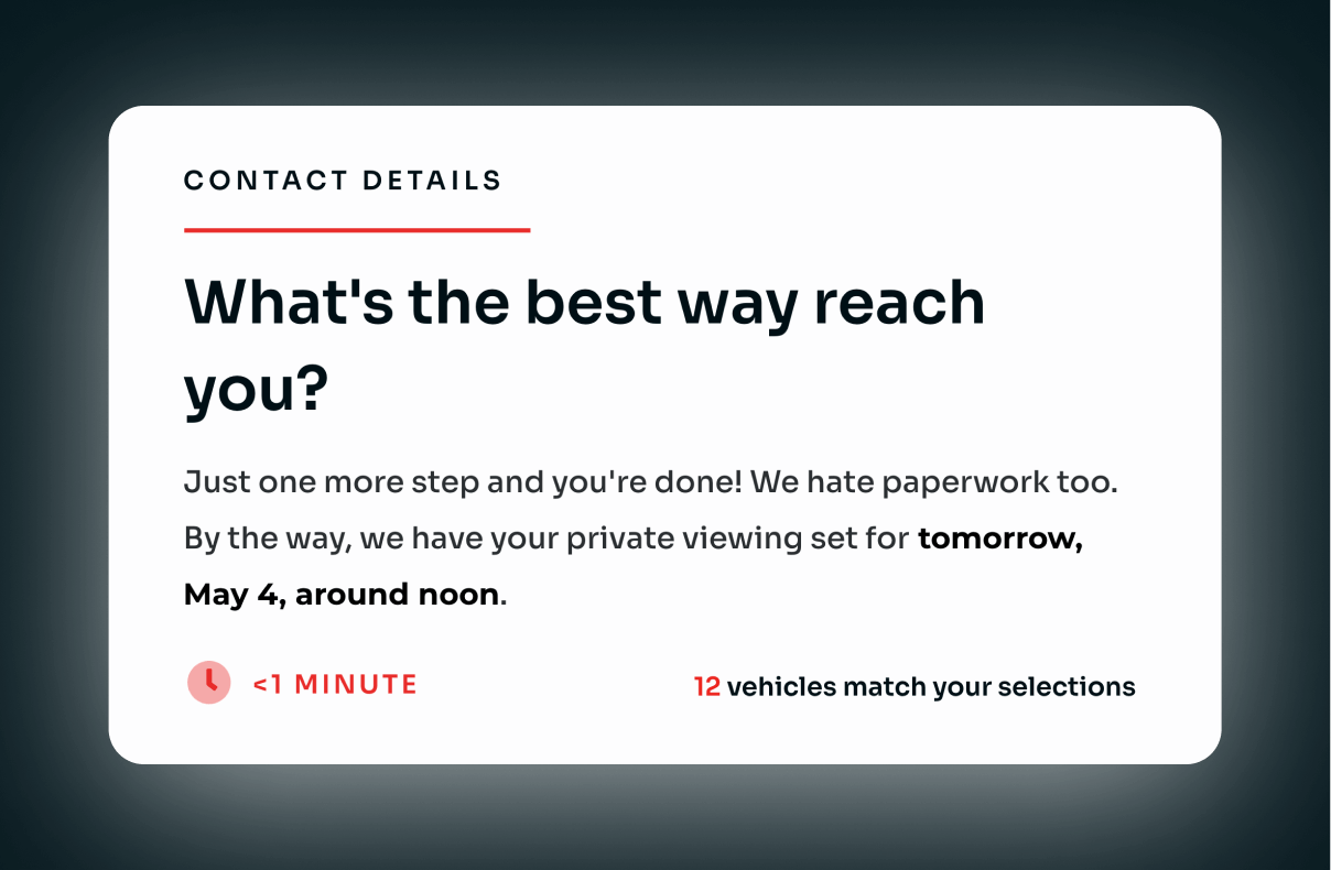 To sweeten the deal at the last second, I utilized progressive disclosure and temptation bundling, showing the number of matches user selections had to in-stock vehicles.