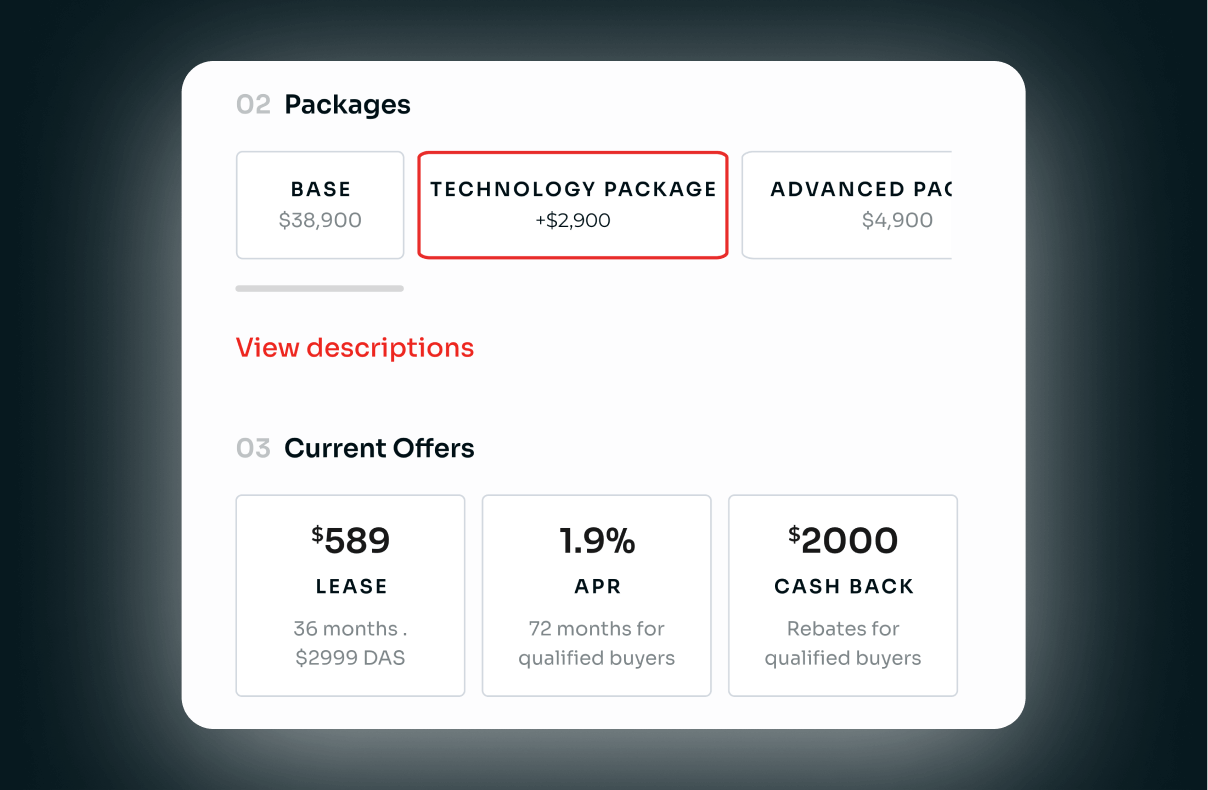 Our initialize POC only covered offers at the trim level, which seemed more real than "in-the-door" offers on the base model, but it did not cover other configuration options or deal building.