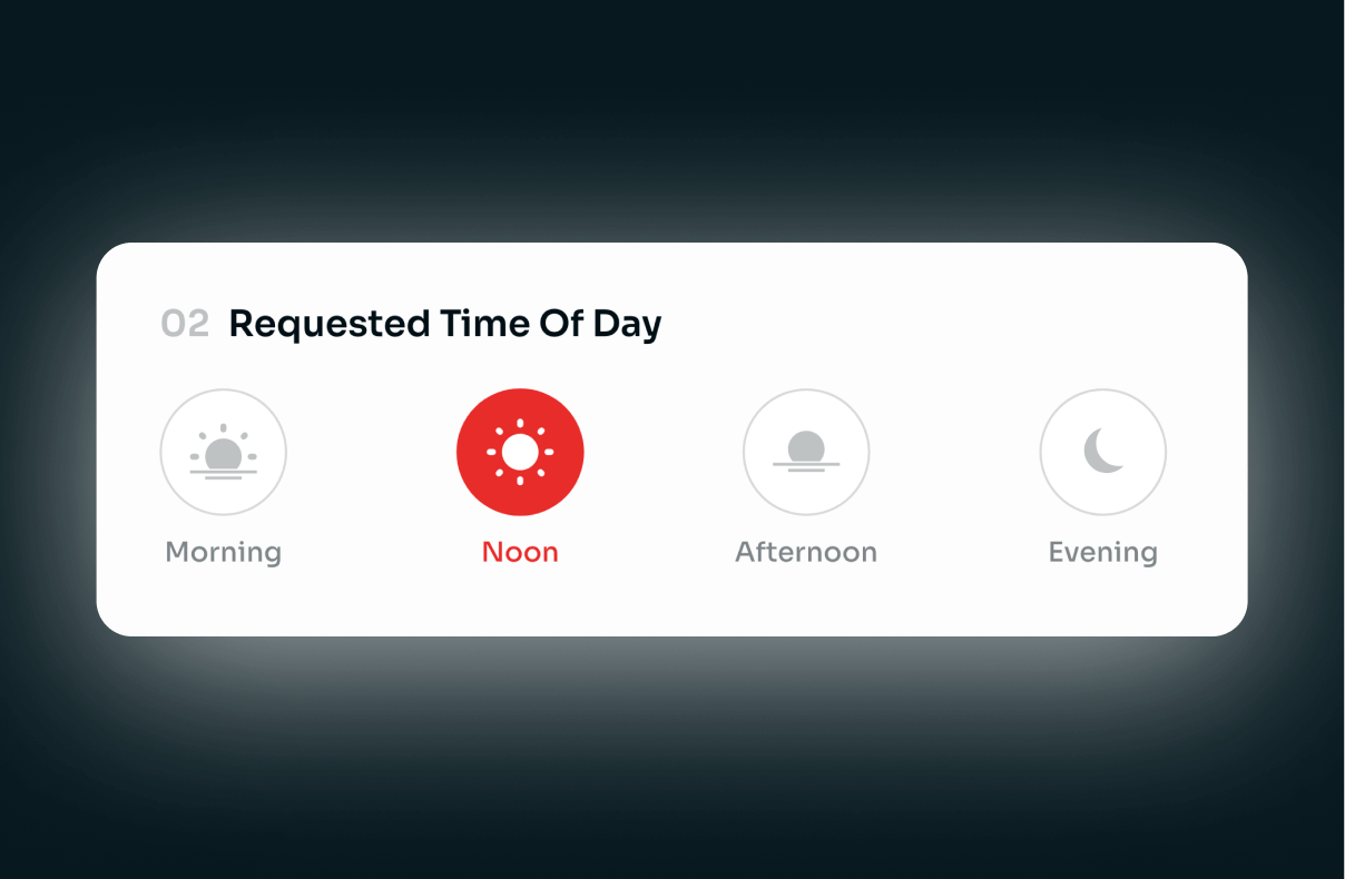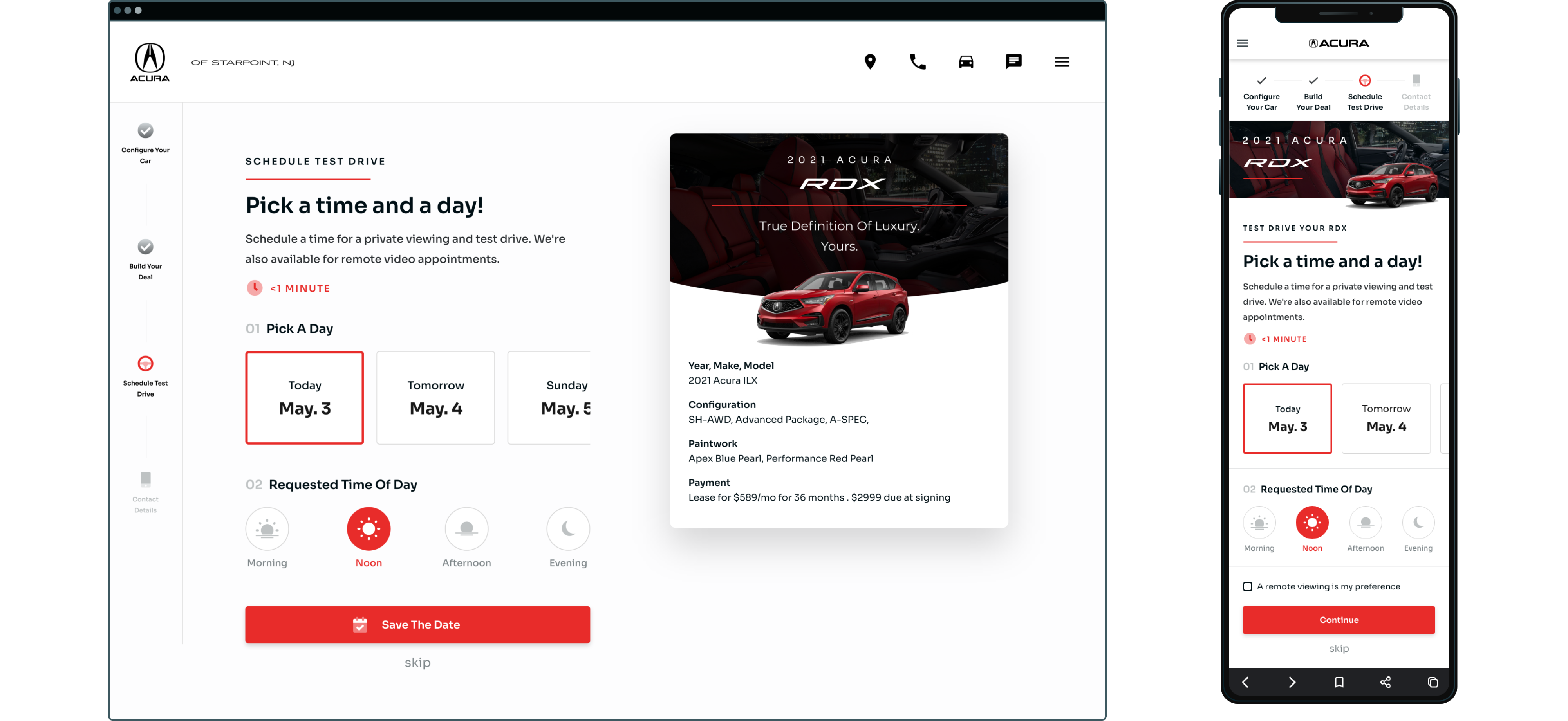 Now, excited about their vehicle and in control of the negotiation, shoppers that are ready can book their private viewing, or they can skip this step - again, avoiding backlash from the Reactance Effect. The test drive scheduling UI is based on the casual mental model we uncovered in UXR, where users preferred giving a loose timeframe (i.e., morning).