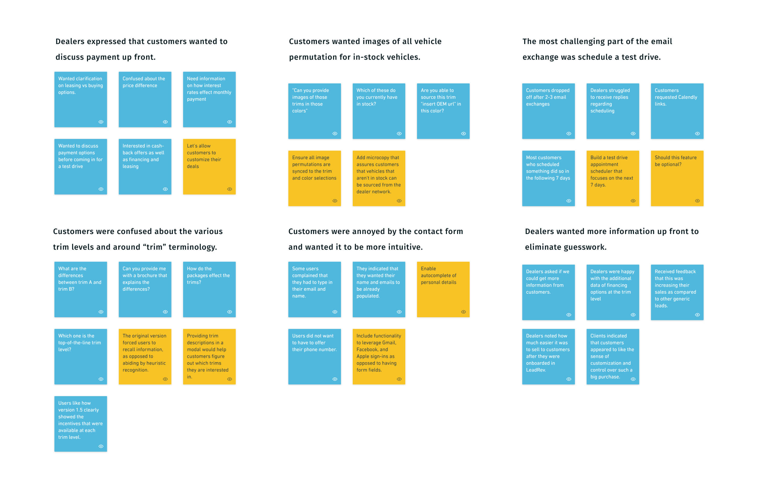 Key insights: We learned a lot. Dealers were guessing what customers wanted. Customers felt unheard and wanted to bargain up front. We mapped opportunities on a priority matrix and got to work on the redesign.