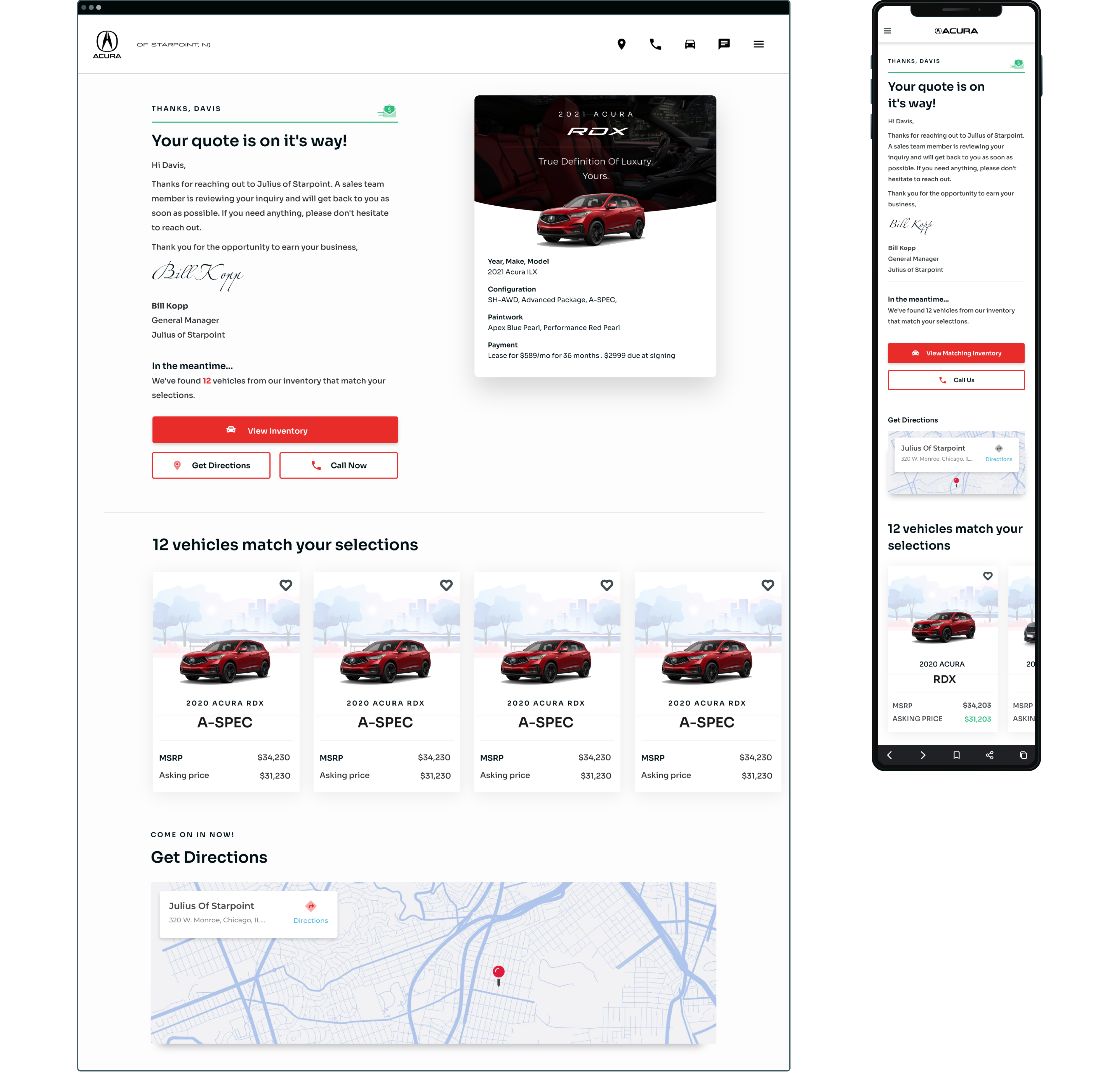Leads are met with a signed letter from the dealer's general manager, and below are the in-stock vehicles that matched their selection, plus directions via Google. Looking back, I would add "# of Watchers" and "# of Offers" on each car to promote scarcity. I would also request location sharing at this point to display more personalized travel details.