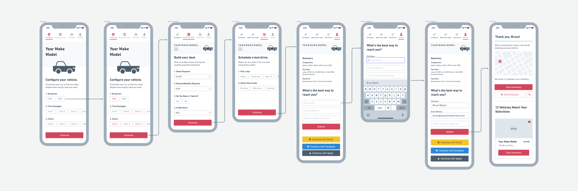 To create the roller-coaster shaped user flow below, the team of designers and I diverged to craft flows independently. Upon converging, the final artifact proposed the multi-step form that divided the experience into three major categories: vehicle configuration, deal building, and appointment scheduling. #chunkingforthewin